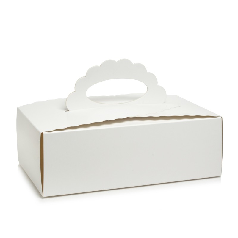 Стильна цільна коробочка-бонбоньєрка з оригінальною зручною ручкою виготовлена з якісного білого крейдованого картону. Призначена для транспортування кондитерських виробів, що захищає від попадання пилу, вологи, сонячних променів. Також може використовуватися для подарунків, сувенірів, мила, виробів хенд мейд.