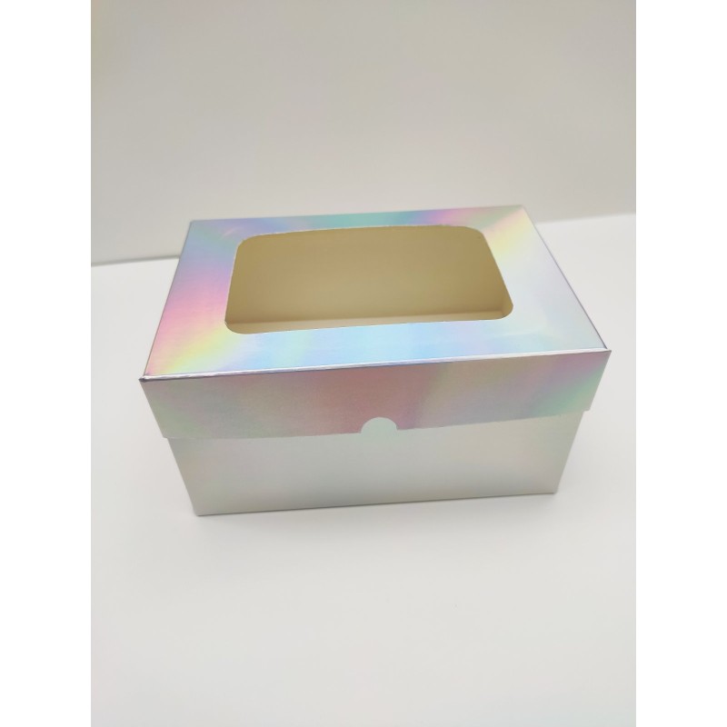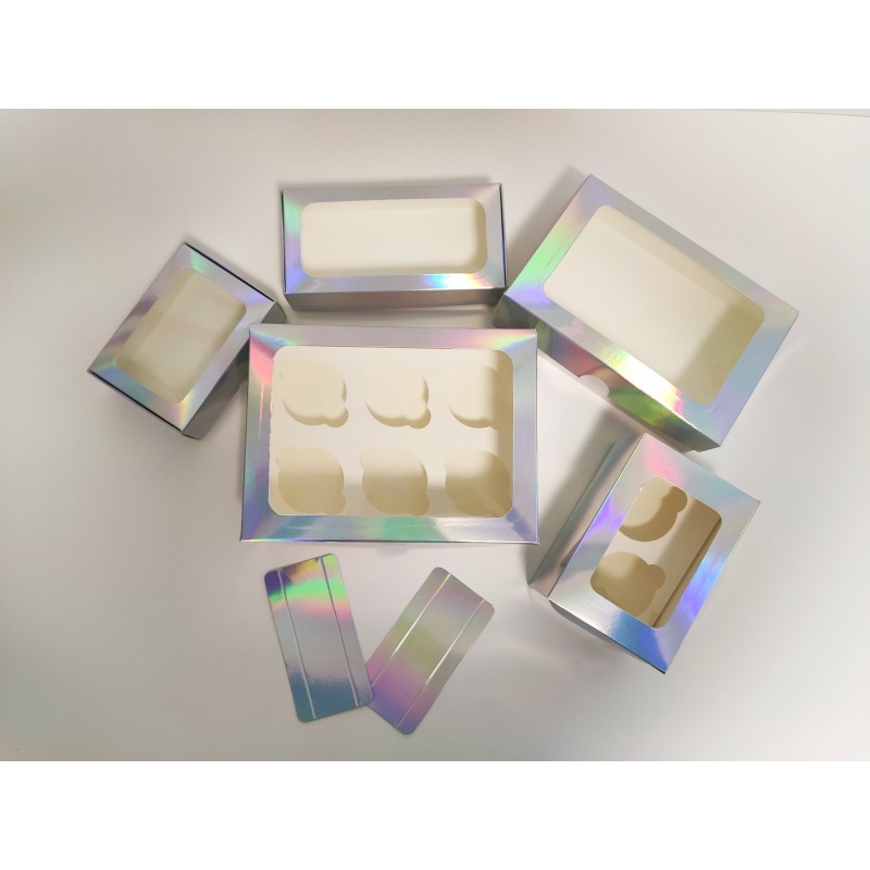 Цільна коробочка з вікном, виготовлена з якісного білого крейдованого картону, покрита ексклюзивною голограмною полінкою. Призначена для транспортування кондитерських виробів, що захищає від попадання пилу, вологи, сонячних променів. Випікання зберігає свій первісний вигляд, не деформується під час перевезення. Капкейки надійно фіксуються всередині завдяки вкладкам, які можна прибрати, якщо коробка використовується для подарунків, сувенірів.