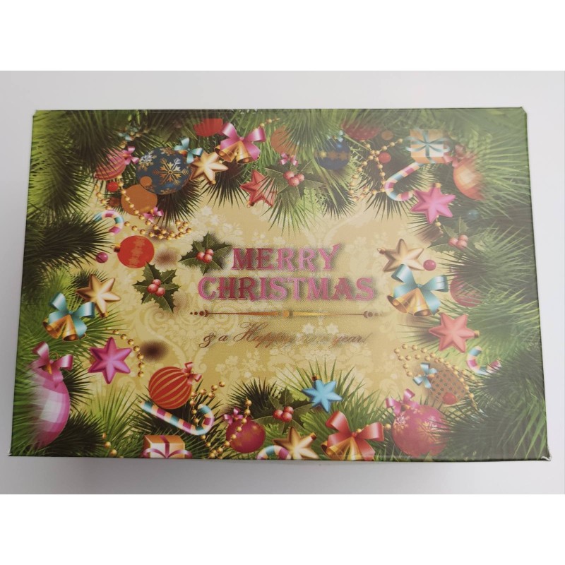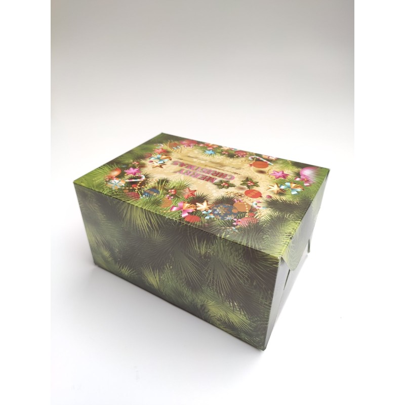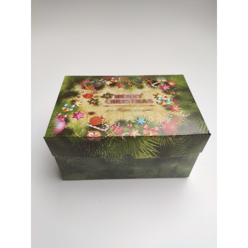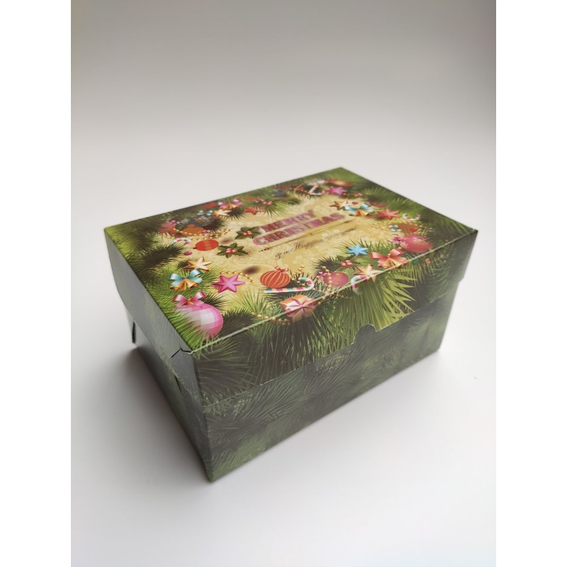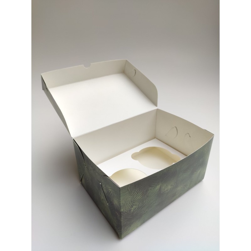 Святкова цільна коробочка, виготовлена з якісного білого крейдованого картону з кольоровим друком з новорічною тематикою. Призначена для транспортування кондитерських виробів, що захищає від попадання пилу, вологи, сонячних променів. Випікання зберігає свій первісний вигляд, не деформується під час перевезення. Капкейки надійно фіксуються всередині завдяки вкладкам, які можна прибрати. Також коробочка може використовуватися для пакування новорічних, різдвяних подарунків, сувенірів, наборів, мила, виробів хенд мейд.