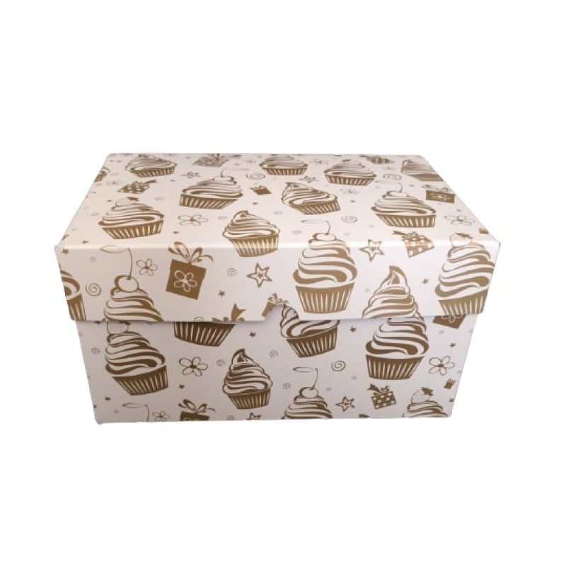 Ця стильна коробочка виготовлена з якісного білого крейдованого картону із золотим друком. Складається з 3 частин: вкладиша, який надійно фіксує виріб усередині; дна та кришки. Призначена для транспортування кондитерських виробів, що захищає від попадання пилу, вологи, сонячних променів. Випікання зберігає свій первісний вигляд, не деформується під час перевезення. Також завдяки стильному дизайну коробочка використовується для подарунків, сувенірів, наборів, мила, виробів хенд-мейд.