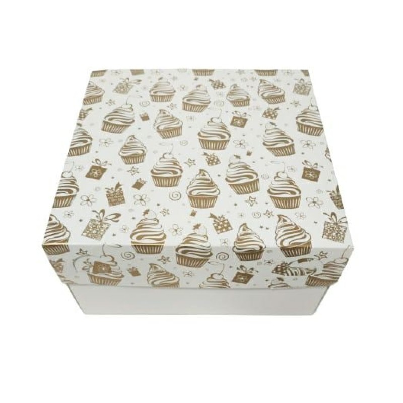 Ця стильна та оригінальна коробочка виготовлена з якісного білого крейдованого картону із золотою печаткою. Складається з 3 частин: вкладиша, що надійно фіксує виріб усередині; дна та кришки. Призначена для транспортування кондитерських виробів, що захищає від попадання пилу, вологи, сонячних променів. Випікання зберігає свій первісний вигляд, не деформується під час перевезення. Вкладки можна забрати, якщо коробка використовується для подарунків, сувенірів, наборів.