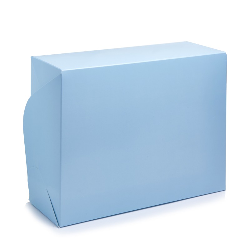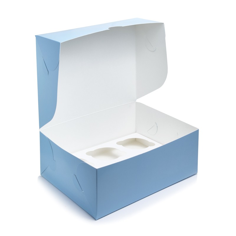 Цільна коробочка, виготовлена з якісного білого крейдованого картону з блакитною печаткою. Призначена для транспортування кондитерських виробів, що захищає від попадання пилу, вологи, сонячних променів. Випікання зберігає свій первісний вигляд, не деформується під час перевезення. Капкейки надійно фіксуються всередині завдяки вкладкам, які можна прибрати, якщо коробка використовується для подарунків, сувенірів.