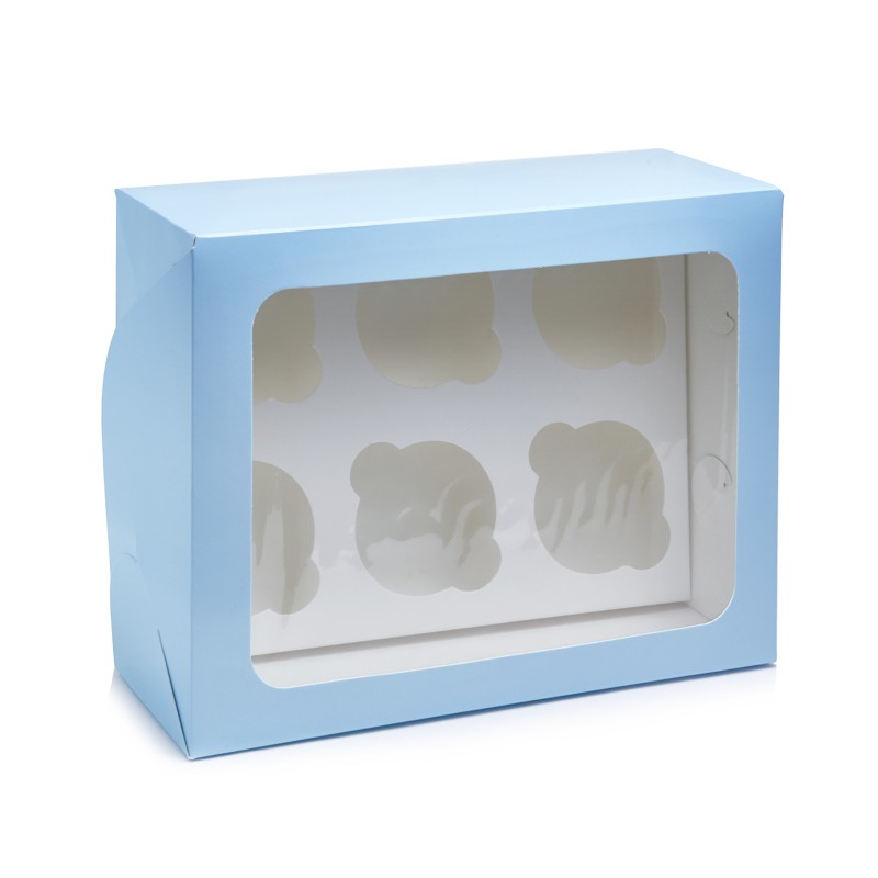 Коробка на 6 капкейків із прямокутним вікном блакитна.