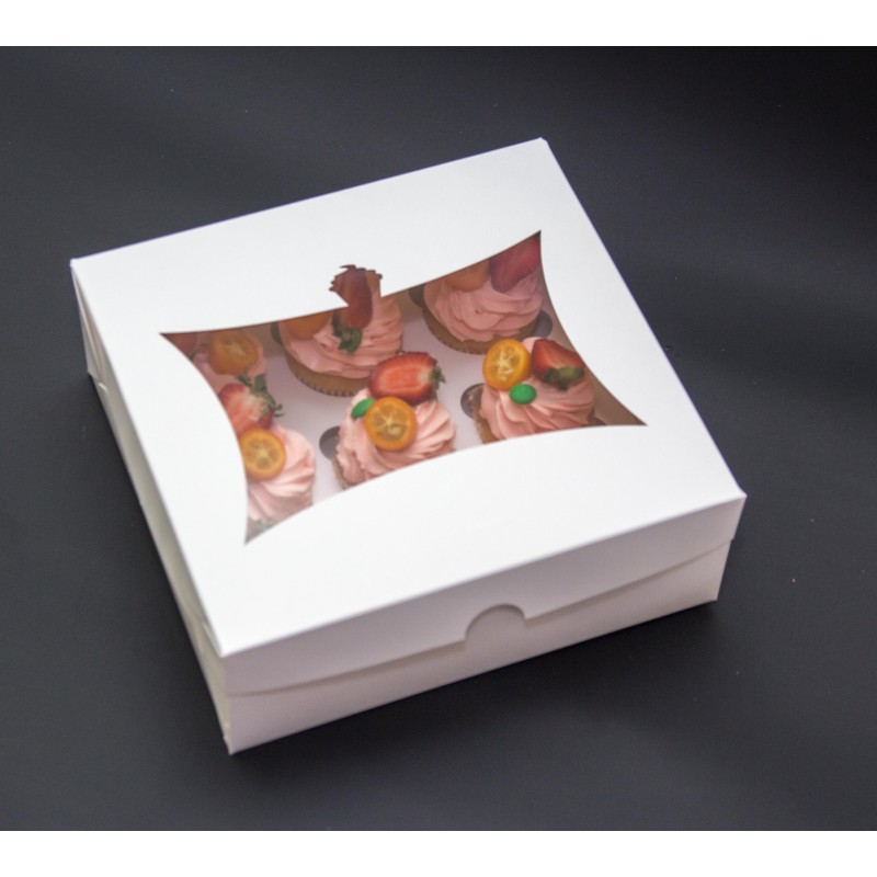 Цільна коробочка, виготовлена з якісного білого крейдованого картону з вікном у вигляді кексу зверху. Призначена для транспортування кондитерських виробів, що захищає від попадання пилу, вологи, сонячних променів. Випікання зберігає свій первісний вигляд, не деформується під час перевезення. Капкейки надійно фіксуються всередині завдяки вкладишам, які можна прибрати, якщо коробка використовується для подарунків, сувенірів.