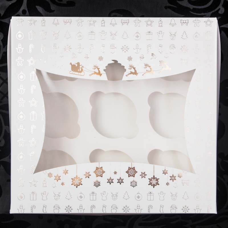 Цільна коробочка у новорічній тематиці виготовлена з якісного білого крейдованого картону із золотим тисненням, яскраво та святково виглядає. Вікно у вигляді кексу зверху дозволяє не тільки бачити ваш виріб, але й контролювати його цілісність під час перевезення. Призначена для транспортування кондитерських виробів, що захищає від попадання пилу, вологи, сонячних променів. Випікання зберігає свій первісний вигляд, не деформується під час перевезення. Капкейки надійно фіксуються всередині завдяки вкладкам, які можна прибрати. Також коробочка може використовуватися для пакування новорічних, різдвяних подарунків, сувенірів.