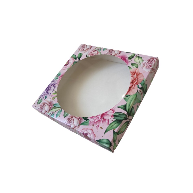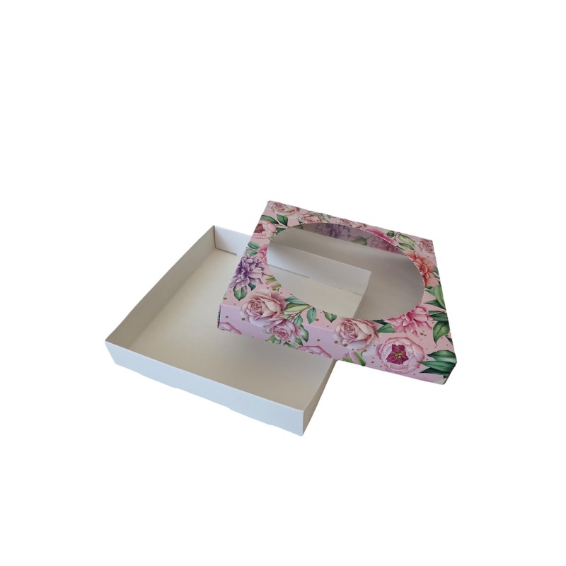 Коробка "Квіти півонія" з вікном із двох частин. Виготовлена з якісного крейдованого картону