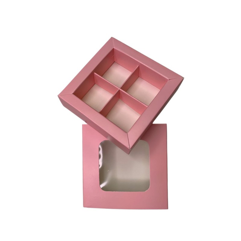 Коробка для 4 цукерок з бортиком з захисним лаком, рожева.Розмір зовнішній - 110*110*30 мм.Розмір комірки - 40*41*30 мм...