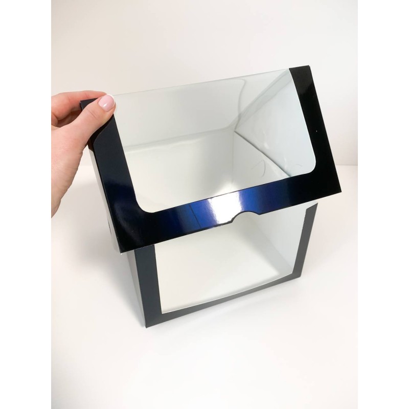 Виготовлена із якісного європейського крейдованого целюлозного картону. Вкрита ексклюзивною ламінацією чорного кольору з синім відтіінком. Панорамне вікно дозволяє бачити ваш виріб як зверху, так і збоку. Презентабельно та зручно транспортувати готовий продукт.