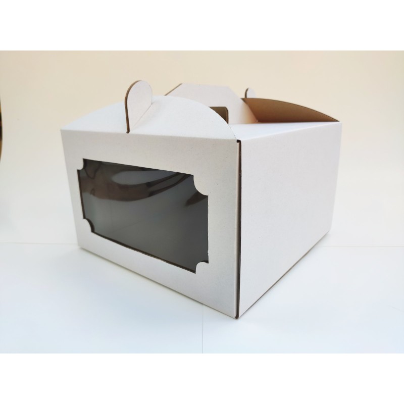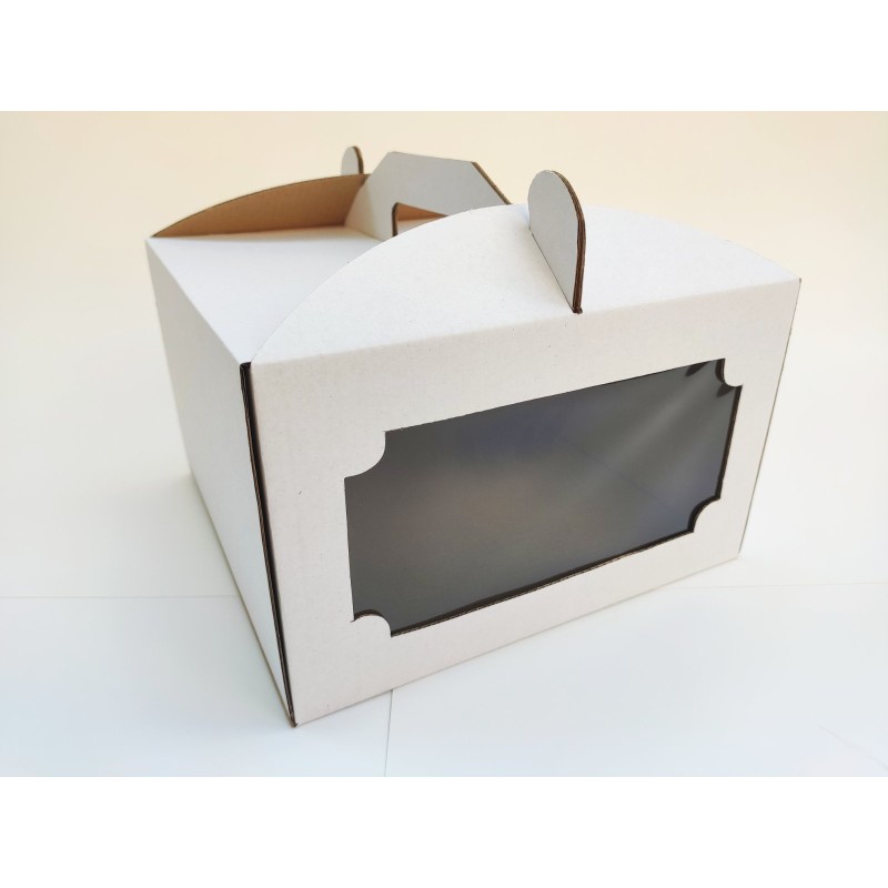 Виготовлена з сучасного якісного тришарового мікрогофрокартону, складається з двох частин. Легко збирається, має зручну ручку. Сучасний матеріал стійкий до пошкоджень, надійно захищає виріб під час перевезення. Екологічно безпечний, не впливає на смак та аромат десерту. Є бічне вікно, захищене плівкою. Вона одночасно не пропускає пил та бруд та дозволяє розглянути декор кондитерського виробу.