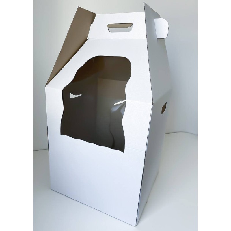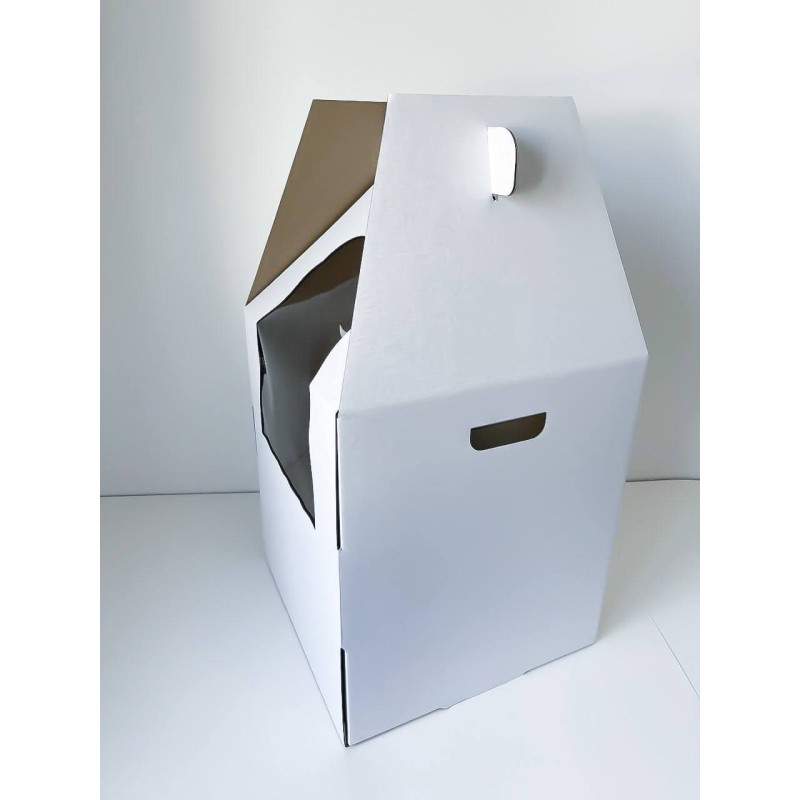 Виготовлена з тришарового мікрогофрокартону. Коробка з вікном з ексклюзивним дизайном під весільні торти, що дозволяє бачити ваш кулінарний шедевр, а також захищає від потрапляння пилу, вологи, сонячних променів. Матеріал вікна - пластик.