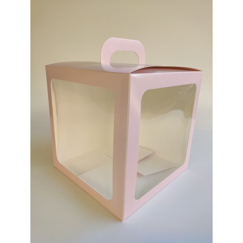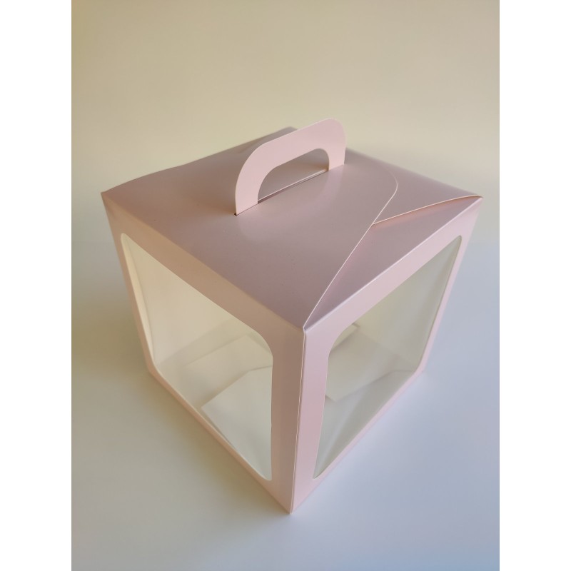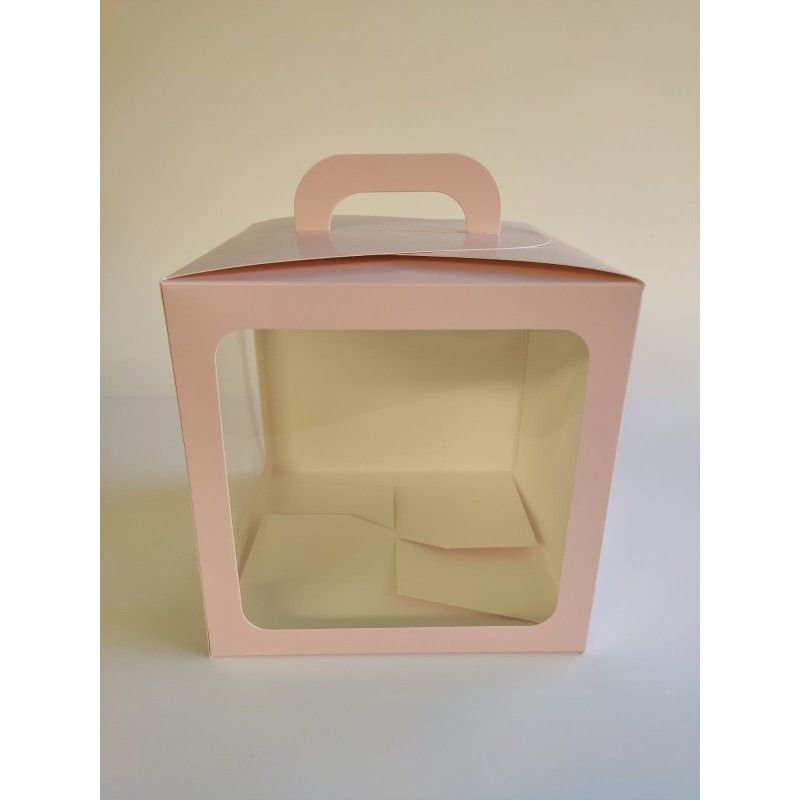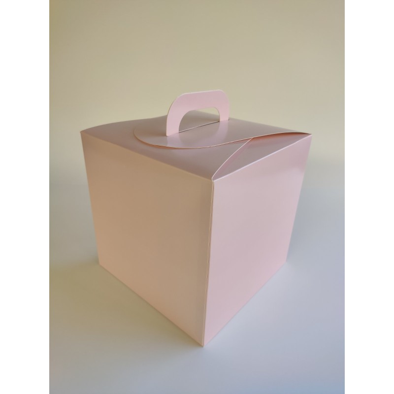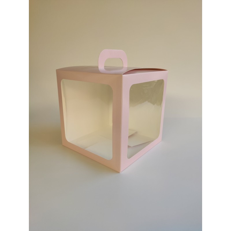 Виготовлена зі щільного білого крейдованого картону з печаткою кольору пудри, покрита захисним лаком. Має ручку та два вікна. Унікальність складання цієї коробки - у міцному склеєному дні.