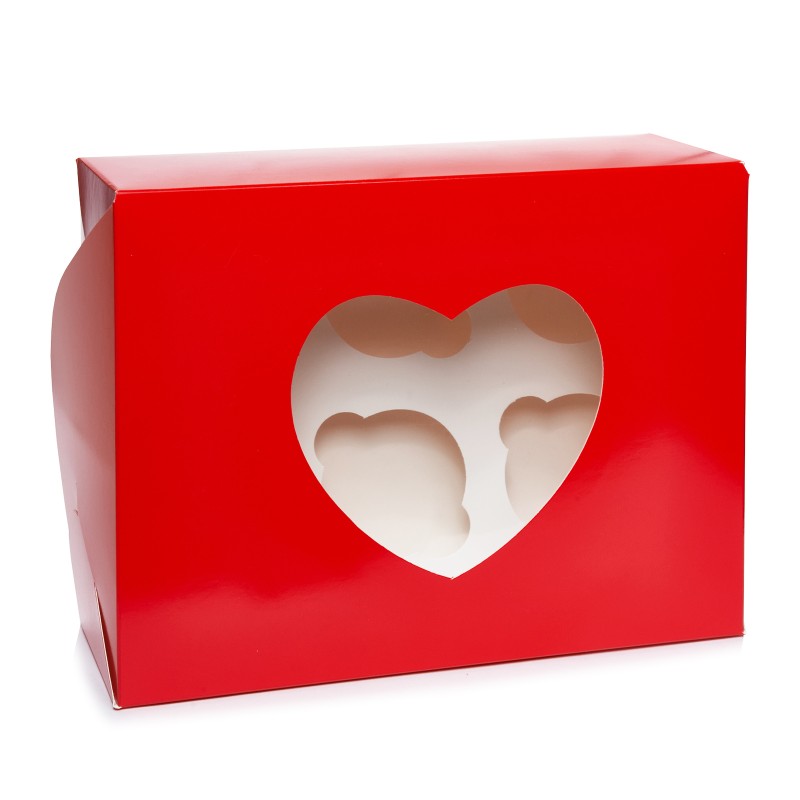 Цільна коробочка з вікном у вигляді серця, виготовлена з якісного білого крейдованого картону з червоним друком. Призначена для транспортування кондитерських виробів, що захищає від попадання пилу, вологи, сонячних променів. Випікання зберігає свій первісний вигляд, не деформується під час перевезення. Капкейки надійно фіксуються всередині завдяки вкладкам, які можна прибрати, якщо коробка використовується для подарунків, сувенірів.