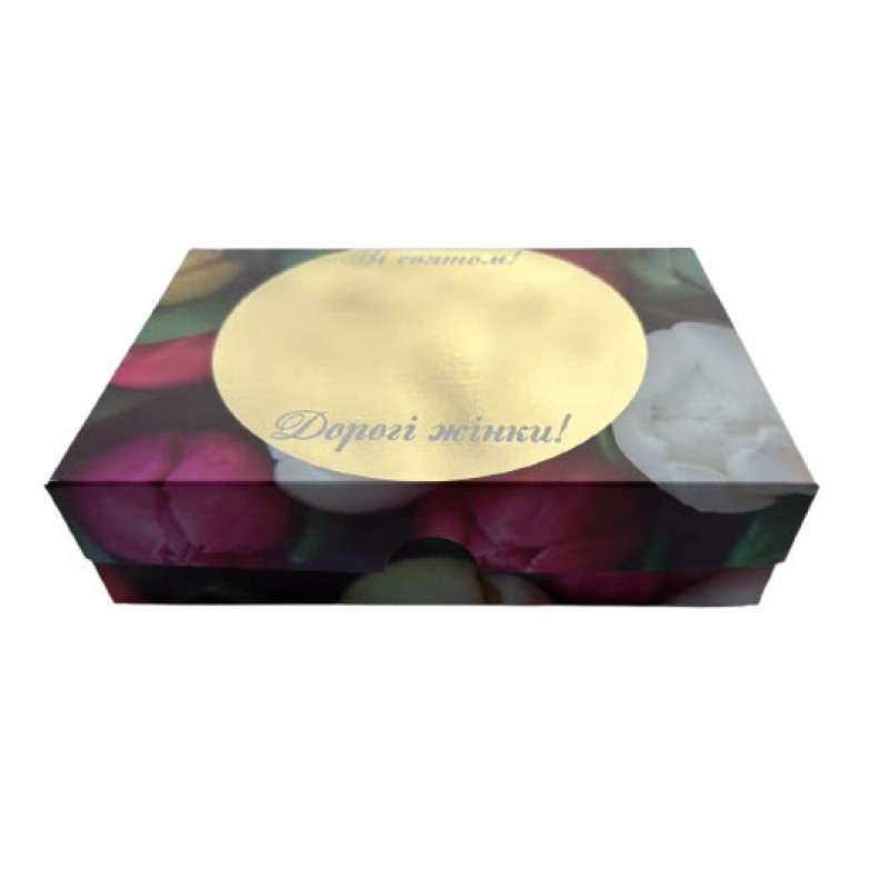 Коробка "Зі святом, дорогі жінки!" для еклерів, тюльпан.Розмір:довжина - 22,5 смширина - 15 см висота - 6...