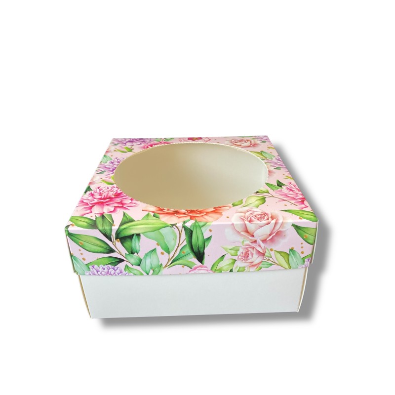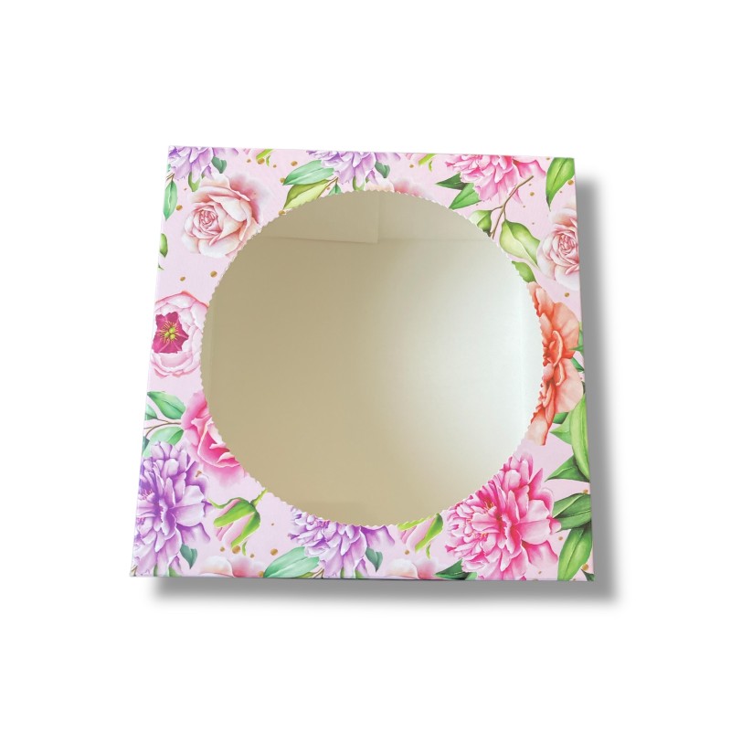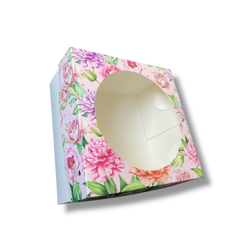 Коробка "Квіти півонія" з круглим вікном із двох частин. Виготовлена з якісного крейдованого картону